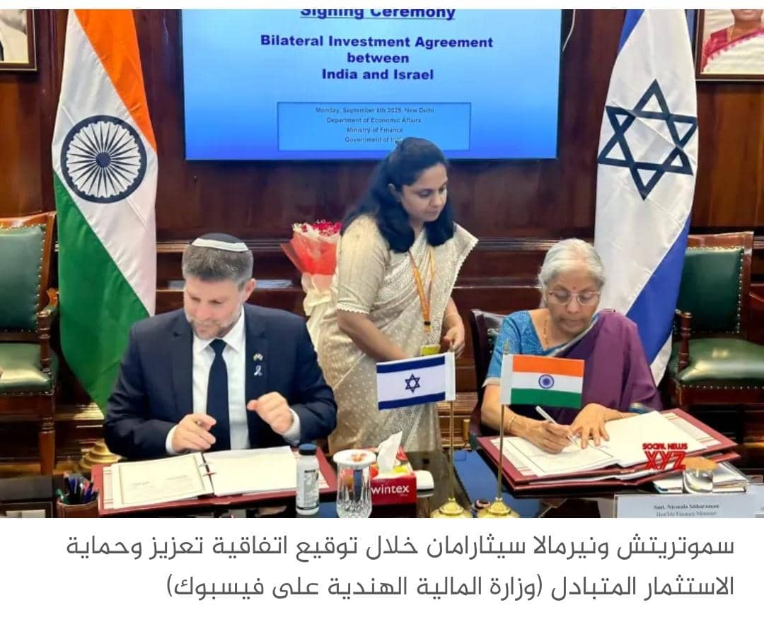 وأضافت الوزارة أن الاتفاقية، التي وقعها وزير مالية إسرائيل بتسلئيل سموتريتش ونظيرته الهندية نيرمالا سيثارامان، في نيودلهي، ستساعد على توسيع التجارة والاستثمار بين إسرائيل والهند.