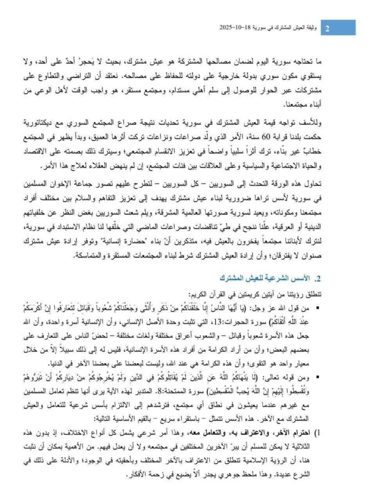 الاخوان المسلمون في سورياوثيقة العيش المشترك جاء فيها