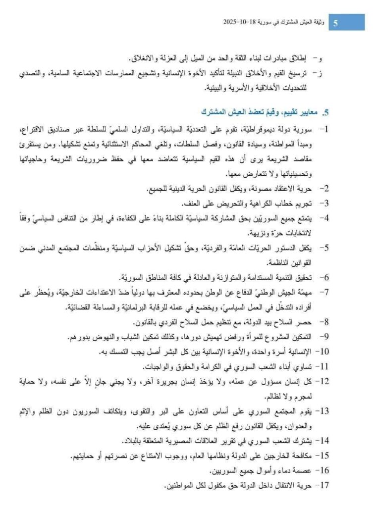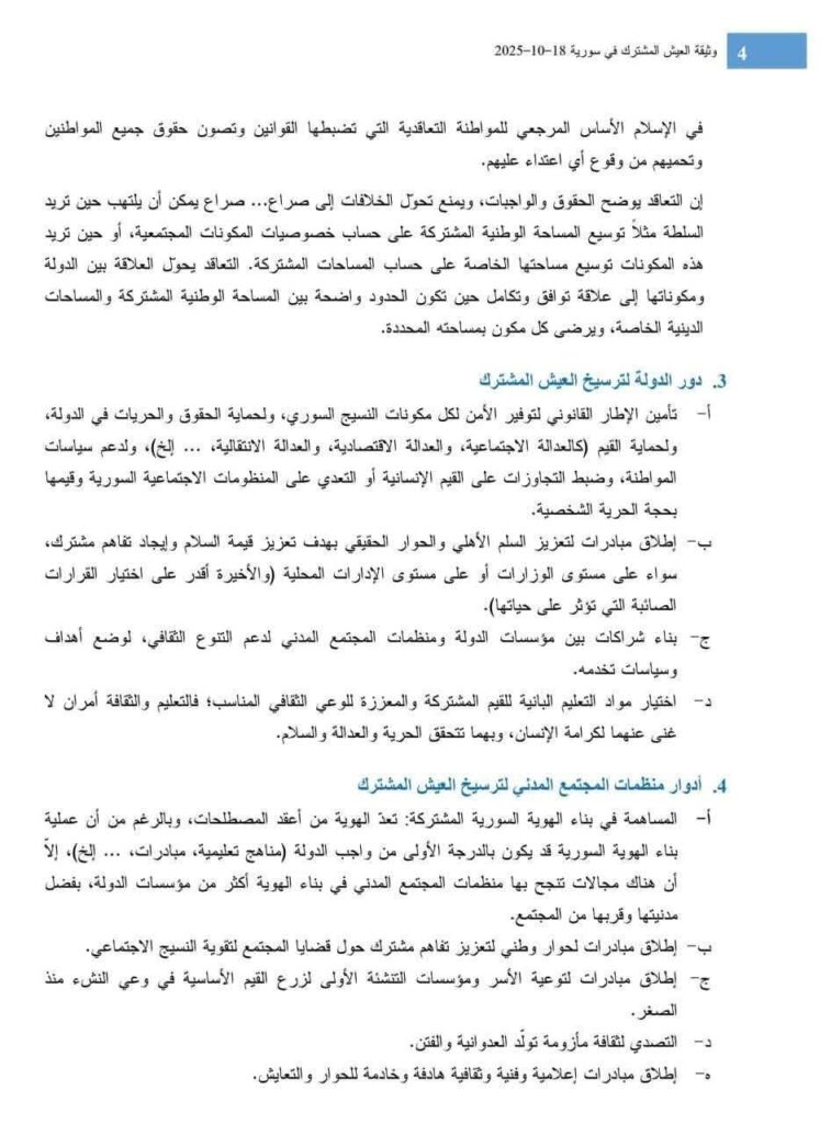 أكدت فيها على أهمية العيش المشترك بين جميع مكونات المجتمع السوري، باعتباره أساساً لتحقيق الاستقرار والسلام وإعادة بناء الهوية الوطنية بعد سنوات من الصراعات والانتهاكات. وتشدد الورقة على أسس شرعية للعيش المشترك تشمل الاحترام المتبادل، العدالة، التعاون، والأخلاق، مع التأكيد على أن الدولة ومنظمات المجتمع المدني عليها دور محوري في ترسيخ هذه القيم وحماية الحقوق والحريات، وتعزيز الحوار والمواطنة المتساوية بين جميع السوريين.