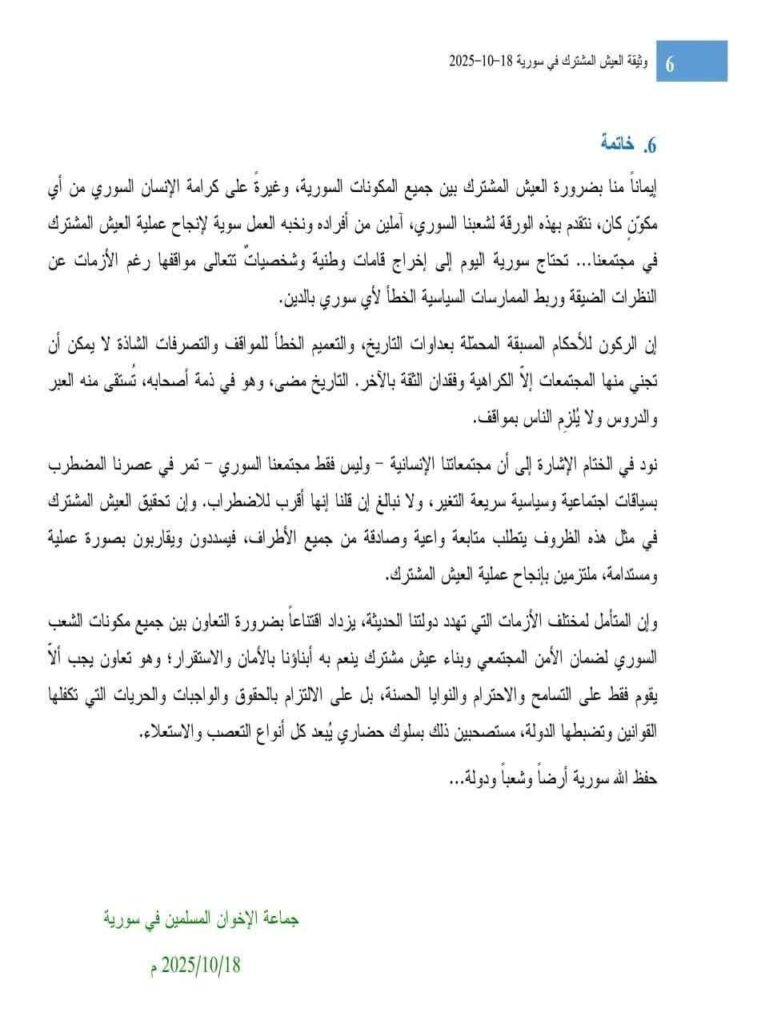 كما تدعو الجماعة إلى وضع إطار قانوني وأخلاقي يضمن الأمن والتنمية والعدالة، ويمنع استغلال الخلافات التاريخية أو الدينية للتحريض على الكراهية، مؤكدة أن نجاح العيش المشترك يتطلب تعاوناً فعلياً ومستداماً بين جميع مكونات الشعب السوري لتحقيق الاستقرار والأمان لأبنائه.
