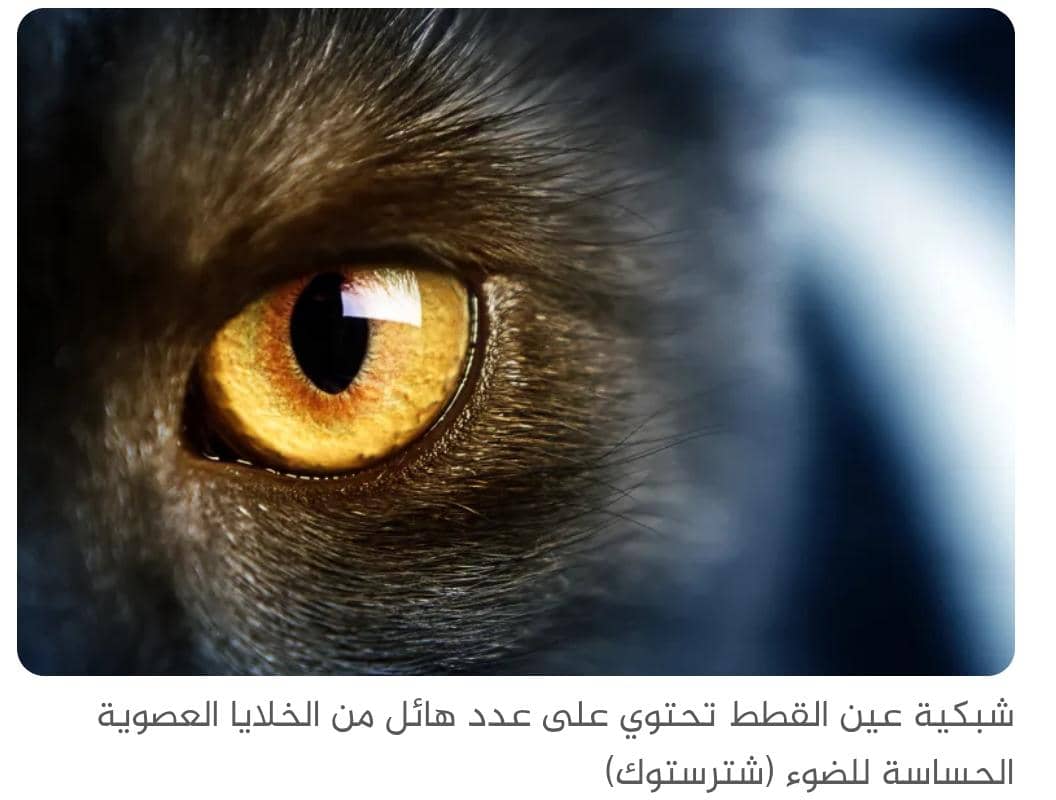 شبكية عين القطط تحتوي على عدد هائل من الخلايا العصوية الحساسة للضوء، وهي أكثر من تلك التي في عين الإنسان بعدة أضعاف. هذه الخلايا تجمع كل فوتون ضوئي متاح، مهما كان ضعيفا، ثم تُعيد طبقة عاكسة خلف الشبكية توجيه الضوء مرة ثانية إلى المستقبلات، مما يضاعف حساسية العين. ولهذا السبب تلمع عيون القطط في الظلام مثل الجواهر، فهي حرفيا تعيد إشعاع الضوء الذي تجمعه.