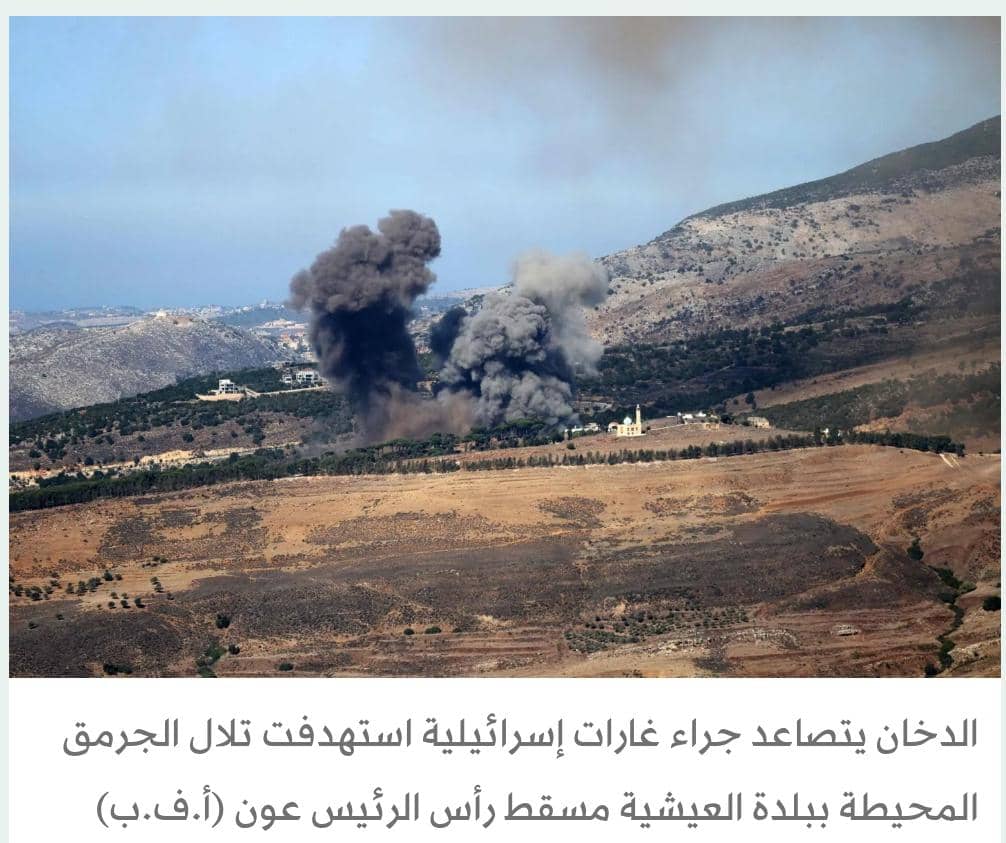 قصفت طائرات إسرائيلية، الخميس، محيط بلدة العيشية في جنوب لبنان، مسقط رأس الرئيس اللبناني جوزيف عون، بالتزامن مع اجتماعه مع قائد الجيش العماد رودولف هيكل، وتكليف الجيش بالتصدي للتوغلات الإسرائيلية في جنوب لبنان. كما حلَّقت مسيَّرات فوق الضاحية الجنوبية لبيروت المحاذية للقصر الرئاسي في بعبدا، بعد إعلان القرار.