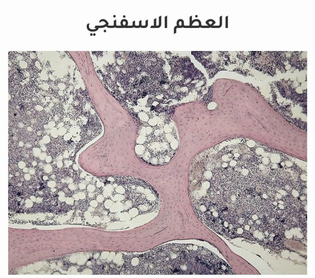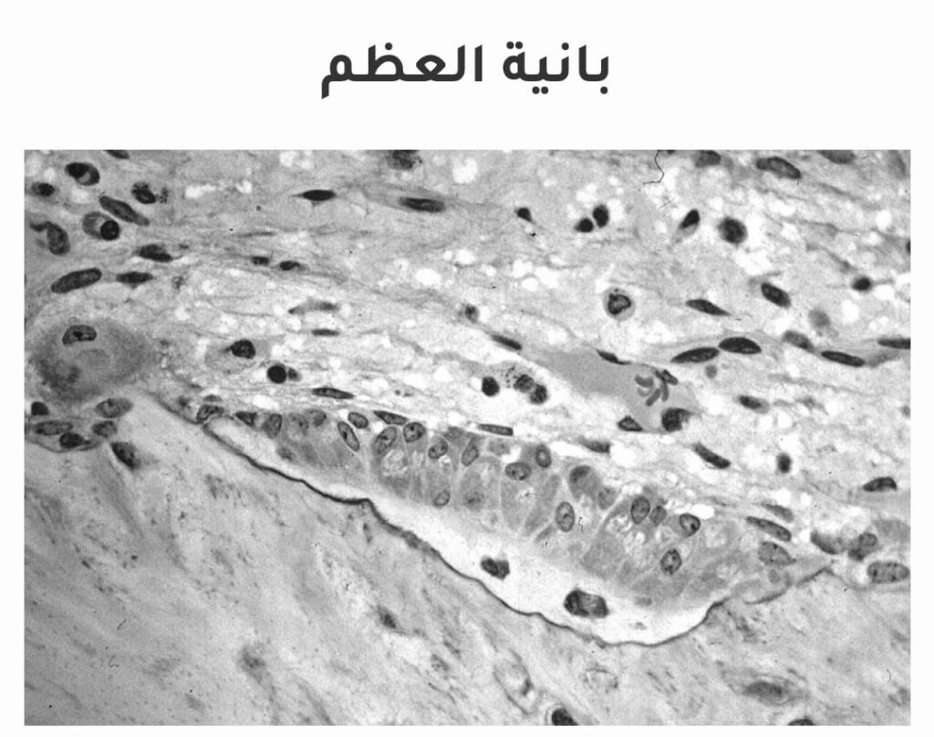 صورة بالمجهر الضوئي لعظم إسفنجي منزوع الكالسيون تُظهر بانيات العظم وهي تصنع النسيج العظماني، وتحتوي على خليتين عظميتين