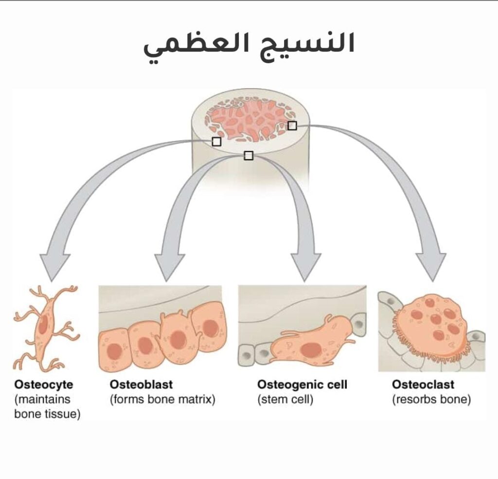 العظم هو نسيج نشط أيضيًا يتكون من أنواع متعددة من الخلايا. تشمل تلك الخلايا بانيات العظم، التي تشارك في صنع وتمعدن نسيج العظم، والخلايا العظمية، وناقضات العظم، التي تشارك فيتشرب العظم.