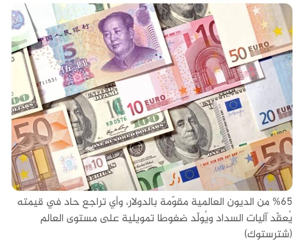 نحو 65% من الديون العالمية مقوّمة بالدولار، وأي تراجع حاد في قيمته يُعقّد آليات السداد ويُولّد ضغوطا تمويلية على مستوى العالم.