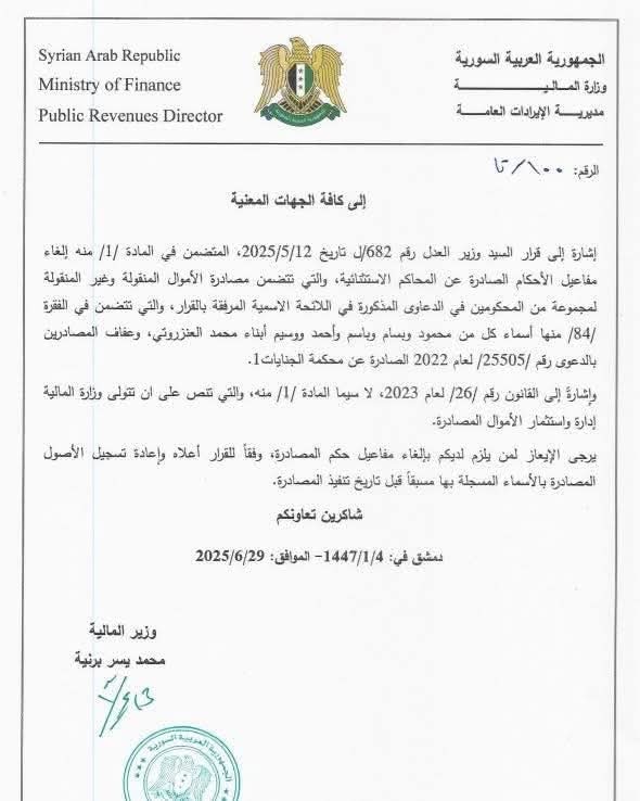 وقالت وزارة المالية إن القرار يأتي في إطار خطة أوسع لإعادة كافة الحقوق المسلوبة إلى أصحابها، ورد المظالم التي ارتُكبت بحق الشعب السوري خلال حقبة الأسد الظالمة.