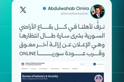 مسؤول التطبيقات والذكاء الاصطناعي في وزارة الاتصالات وتقانة المعلومات عبدالوهاب عميرة في منشور عبر منصة X: أسامينا نزفُّ لأهلنا في كل بقاع الأراضي السورية بشرى سارة طال انتظارها وهي الإعلان عن إزالة آ...